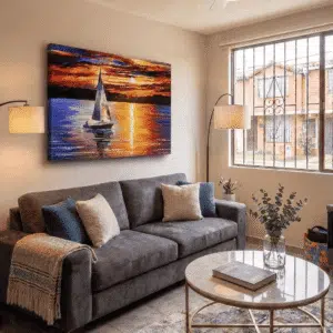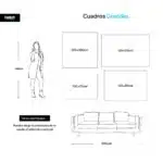Para que tu espacio luzca equilibrado, te recomendamos seguir la regla de oro del diseño de interiores: el cuadro debe medir aproximadamente dos tercios (2/3) del ancho del mueble que tiene debajo, ya sea tu sofá principal, una cama o una consola.