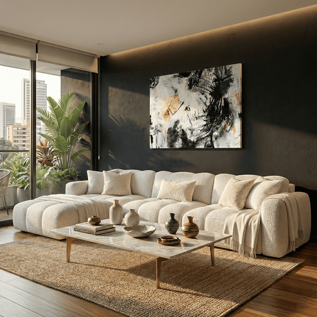 Para que tu espacio luzca equilibrado, te recomendamos seguir la regla de oro del diseño de interiores: el cuadro debe medir aproximadamente dos tercios (2/3) del ancho del mueble que tiene debajo, ya sea tu sofá principal, una cama o una consola.