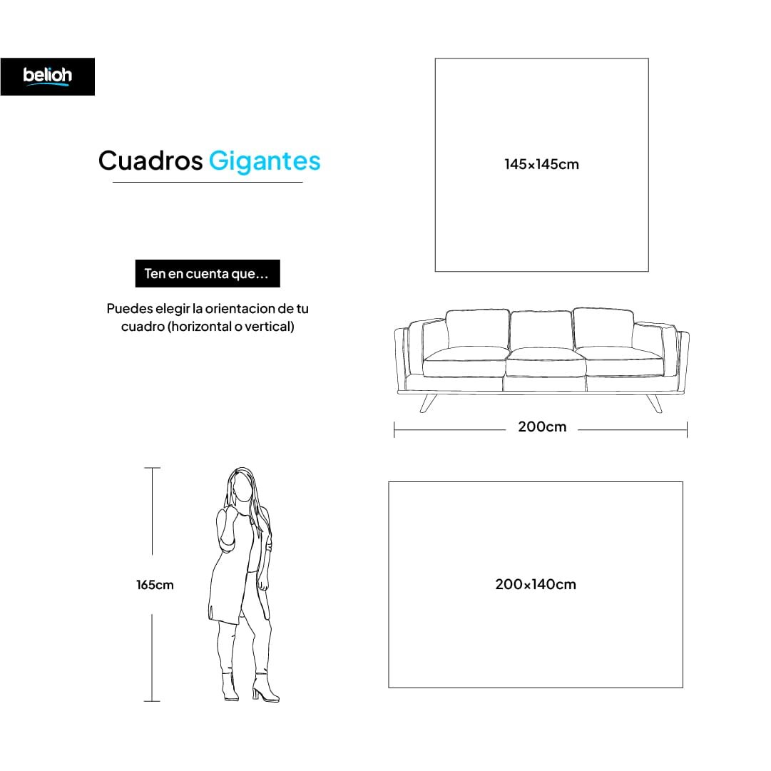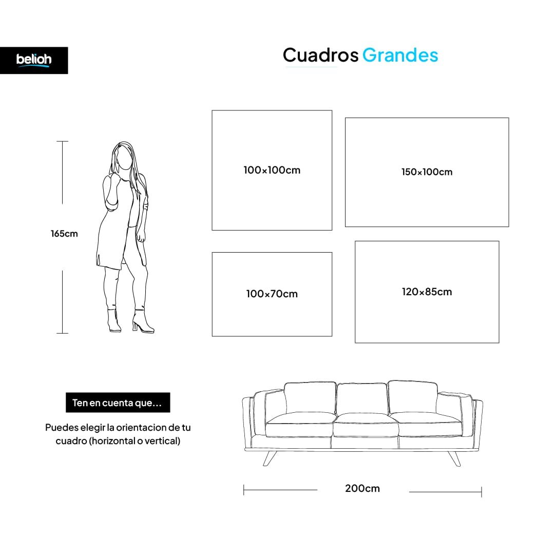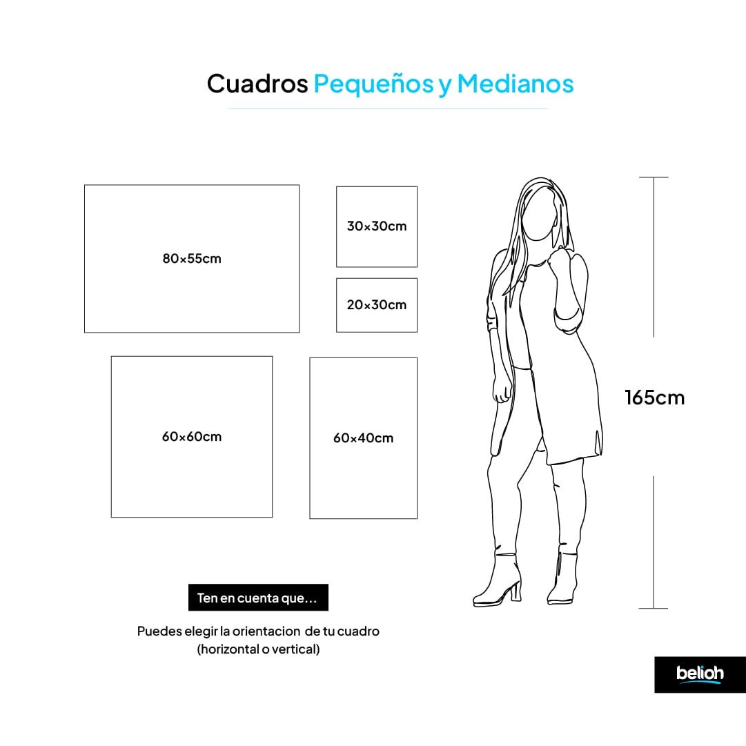 Elegir el tamaño perfecto es la clave para que tu obra transforme el espacio. Hemos diseñado esta guía utilizando una referencia de altura estándar (1.60 m) para que puedas visualizar, con total precisión, la escala de cada medida en tu pared.