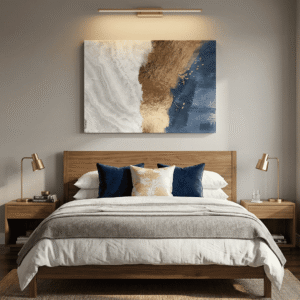 Para que tu espacio luzca equilibrado, te recomendamos seguir la regla de oro del diseño de interiores: el cuadro debe medir aproximadamente dos tercios (2/3) del ancho del mueble que tiene debajo, ya sea tu sofá principal, una cama o una consola.