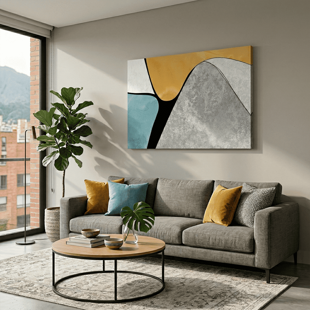 Para que tu espacio luzca equilibrado, te recomendamos seguir la regla de oro del diseño de interiores: el cuadro debe medir aproximadamente dos tercios (2/3) del ancho del mueble que tiene debajo, ya sea tu sofá principal, una cama o una consola.
