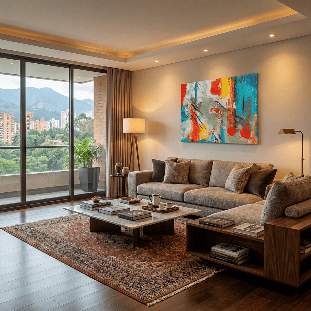Para que tu espacio luzca equilibrado, te recomendamos seguir la regla de oro del diseño de interiores: el cuadro debe medir aproximadamente dos tercios (2/3) del ancho del mueble que tiene debajo, ya sea tu sofá principal, una cama o una consola.